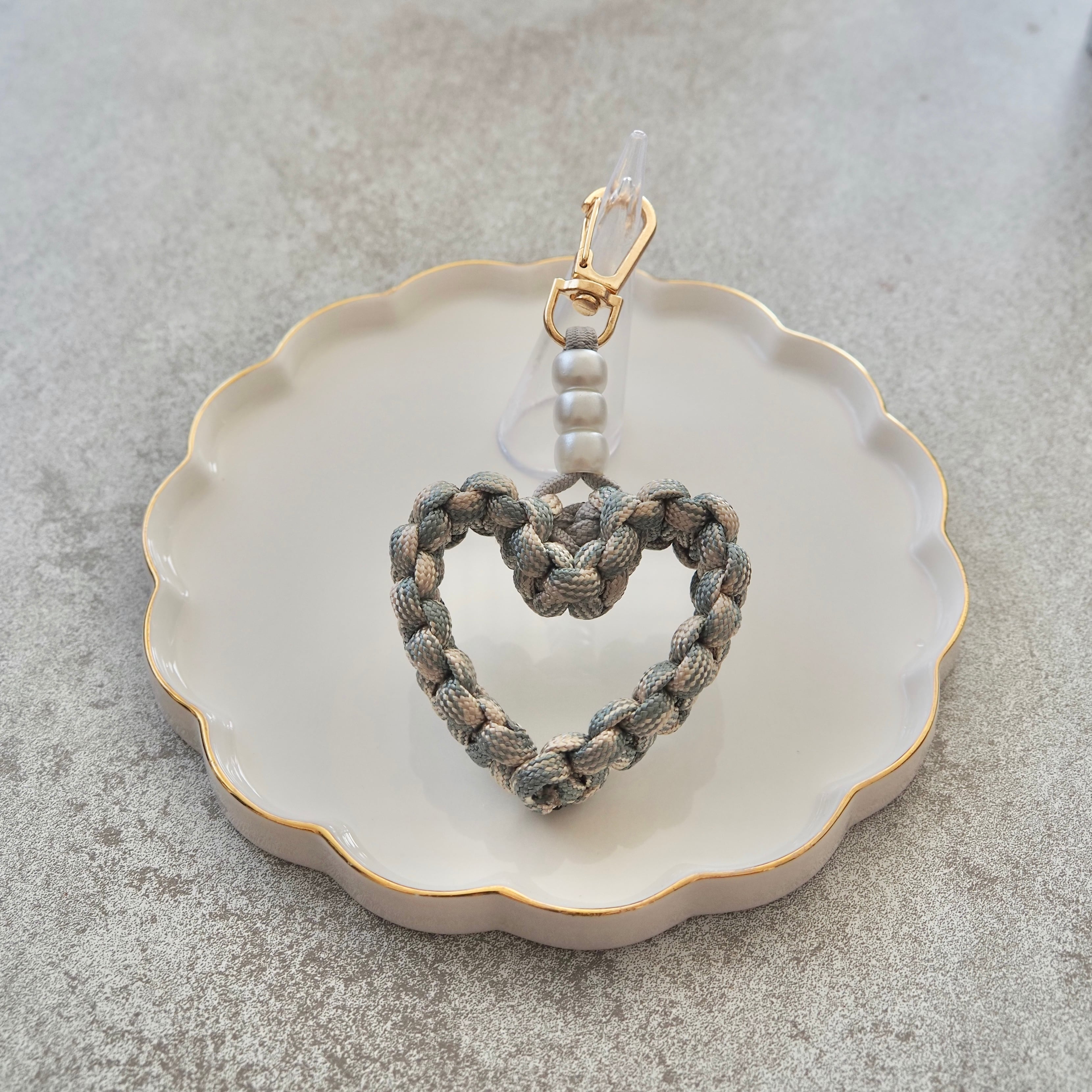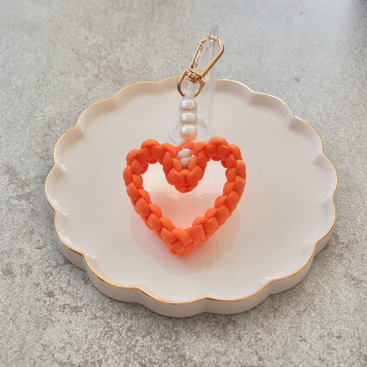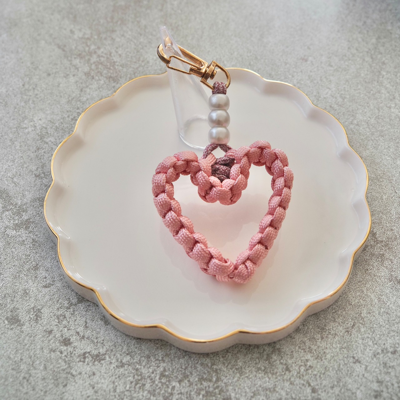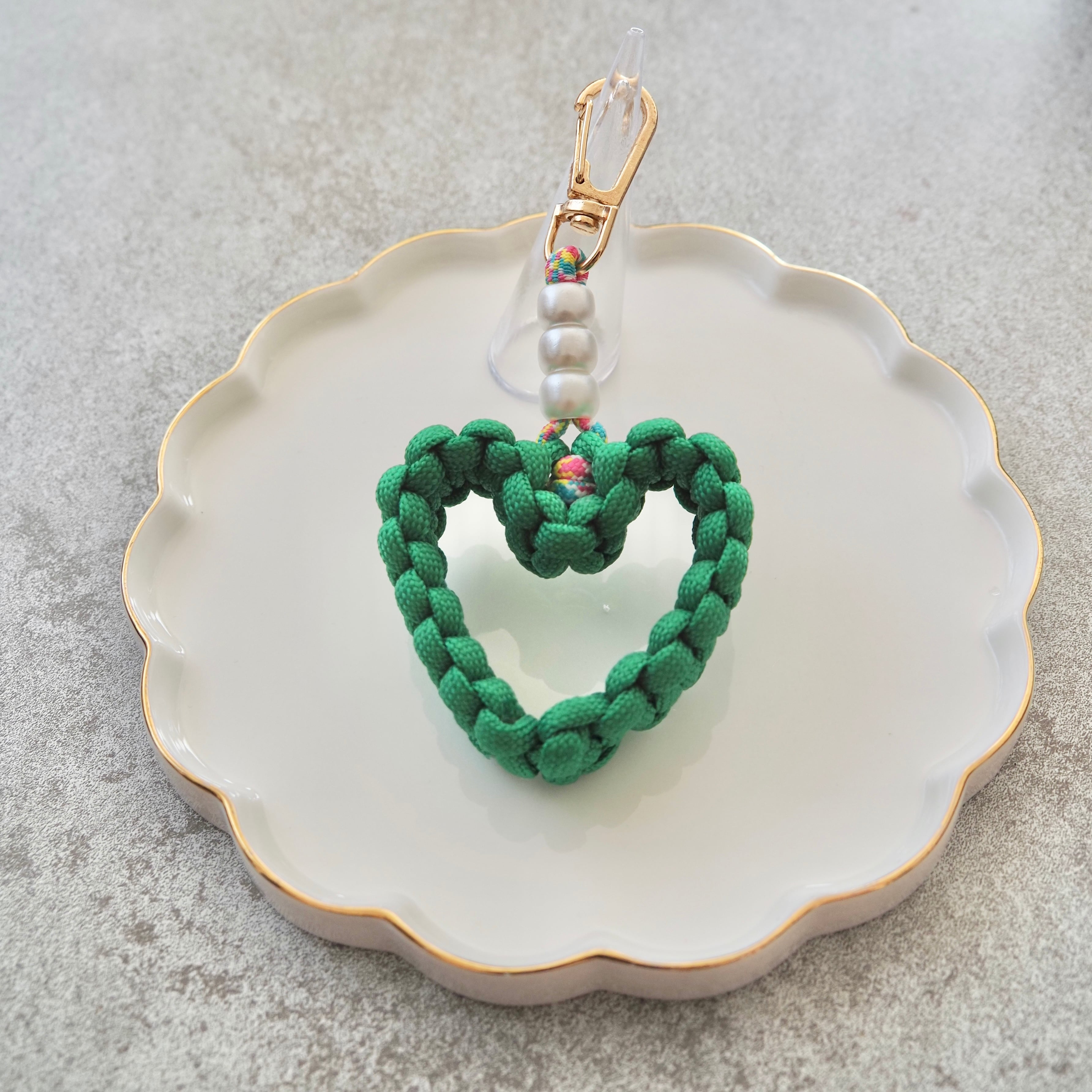 しっかり編み込んだパラコードで作ったハート型チャームに、パールをプラスして可愛さ&上品さをプラス✨